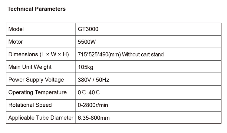 The GT3000 Blocked Pipe Dredging Machine features manual/remote dual-mode operation and dual-shaft blockage removal. The motor speed is adjustable (0–2800 r/min). The unit comes with built-in storage functionality, integrating control and dredging into one design. The push rod serves both as a carrying handle and a flexible shaft hanger. The control panel is embedded, and the machine is equipped with a leakage protection switch and an emergency stop switch to ensure operational safety. It is suitable for cleaning the inner surfaces of heat exchange tubes such as air preheaters, power plant condensers, air preheaters, and primary gas coolers, as well as for dredging, cleaning, and polishing the inner surfaces of pipes in various pipe manufacturing enterprises.